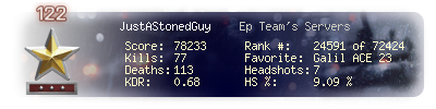 | Headshots | 174 | Suicides | 35 | Headshot / Kill | 12.71 % |