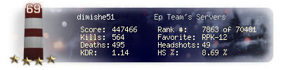 | Headshots | 49 | Suicides | 29 | Headshot / Kill | 8.32 % |