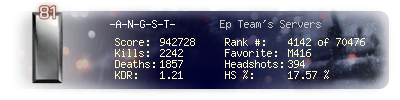 | Headshots | 591 | Suicides | 27 | Headshot / Kill | 17.93 % |