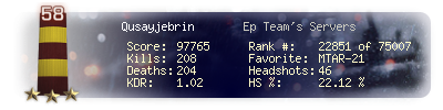 | Headshots | 46 | Suicides | 5 | Headshot / Kill | 22.12 % |