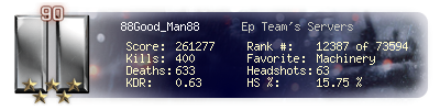 | Kills | 400 | Deaths | 633 | Kill / Death | 0.63 |