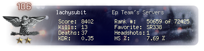 | Kill-streak | 3 | Death-streak | 12 | Team Kills | 0 |