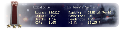 | Headshots | 400 | Suicides | 13 | Headshot / Kill | 18.25 % |