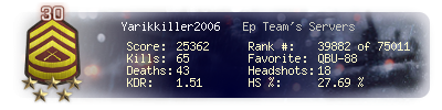 | Headshots | 18 | Suicides | 1 | Headshot / Kill | 27.69 % |