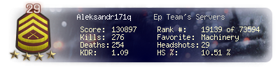 | Headshots | 29 | Suicides | 9 | Headshot / Kill | 10.51 % |