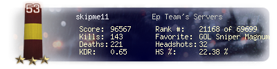 | Headshots | 32 | Suicides | 6 | Headshot / Kill | 22.38 % |