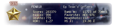 | Headshots | 197 | Suicides | 6 | Headshot / Kill | 19.98 % |
