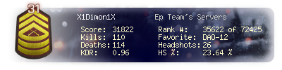| Headshots | 26 | Suicides | 3 | Headshot / Kill | 23.64 % |