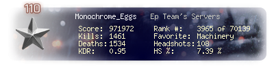 | Headshots | 108 | Suicides | 110 | Headshot / Kill | 7.39 % |