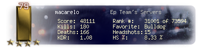 | Headshots | 15 | Suicides | 2 | Headshot / Kill | 8.33 % |
