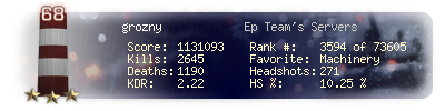 | Headshots | 322 | Suicides | 81 | Headshot / Kill | 9.87 % |