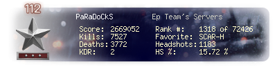 | Headshots | 1183 | Suicides | 61 | Headshot / Kill | 15.72 % |