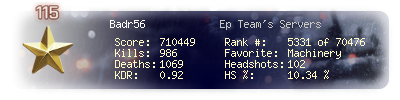 | Headshots | 102 | Suicides | 15 | Headshot / Kill | 10.34 % |