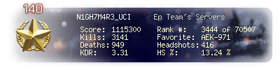 | Kills | 3141 | Deaths | 949 | Kill / Death | 3.31 |