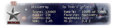 | Headshots | 22 | Suicides | 8 | Headshot / Kill | 9.4 % |