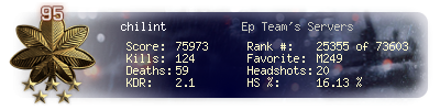 | Headshots | 20 | Suicides | 1 | Headshot / Kill | 16.13 % |