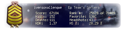 | Headshots | 43 | Suicides | 2 | Headshot / Kill | 28.29 % |
