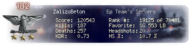 | Headshots | 383 | Suicides | 19 | Headshot / Kill | 13.56 % |