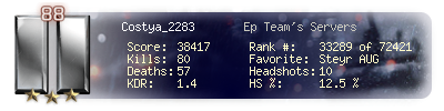 | Headshots | 10 | Suicides | 0 | Headshot / Kill | 12.5 % |
