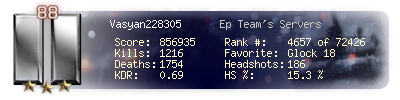 | Headshots | 885 | Suicides | 70 | Headshot / Kill | 13.95 % |