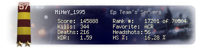 | Headshots | 56 | Suicides | 2 | Headshot / Kill | 16.28 % |