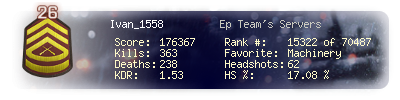 | Headshots | 53 | Suicides | 3 | Headshot / Kill | 15.63 % |