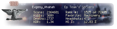 | Headshots | 422 | Suicides | 37 | Headshot / Kill | 12.1 % |