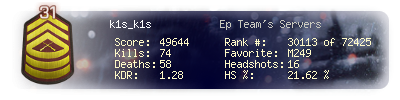 | Headshots | 16 | Suicides | 1 | Headshot / Kill | 21.62 % |