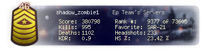 | Headshots | 89 | Suicides | 3 | Headshot / Kill | 19.35 % |