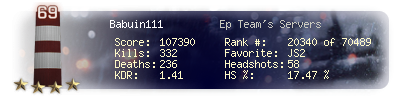 | Headshots | 58 | Suicides | 3 | Headshot / Kill | 17.47 % |