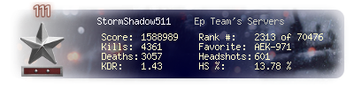 | Headshots | 1003 | Suicides | 308 | Headshot / Kill | 13.24 % |