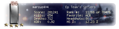 | Headshots | 80 | Suicides | 6 | Headshot / Kill | 12.23 % |