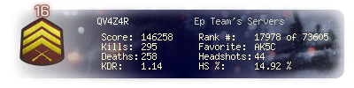| Headshots | 44 | Suicides | 2 | Headshot / Kill | 14.92 % |