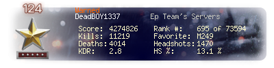 | Headshots | 1470 | Suicides | 63 | Headshot / Kill | 13.1 % |