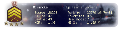 | Headshots | 7 | Suicides | 2 | Headshot / Kill | 14.89 % |