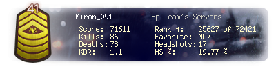 | Headshots | 17 | Suicides | 2 | Headshot / Kill | 19.77 % |