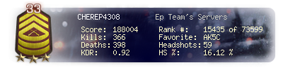 | Headshots | 59 | Suicides | 8 | Headshot / Kill | 16.12 % |