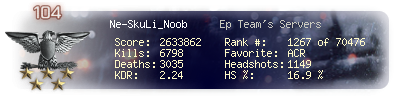 | Headshots | 1248 | Suicides | 77 | Headshot / Kill | 16.85 % |