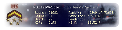 | Headshots | 5 | Suicides | 3 | Headshot / Kill | 18.52 % |