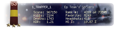 | Headshots | 427 | Suicides | 31 | Headshot / Kill | 19.78 % |