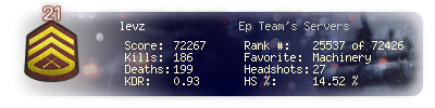 | Headshots | 27 | Suicides | 6 | Headshot / Kill | 14.52 % |