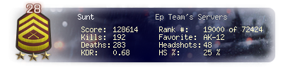 | Headshots | 48 | Suicides | 3 | Headshot / Kill | 25 % |
