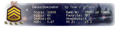 | Headshots | 6 | Suicides | 1 | Headshot / Kill | 15 % |