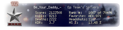 | Headshots | 1107 | Suicides | 63 | Headshot / Kill | 13.48 % |