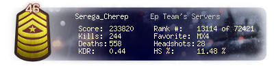 | Headshots | 28 | Suicides | 3 | Headshot / Kill | 11.48 % |