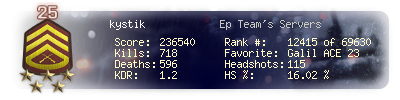 | Headshots | 115 | Suicides | 8 | Headshot / Kill | 16.02 % |