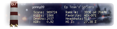 | Headshots | 377 | Suicides | 13 | Headshot / Kill | 26.53 % |