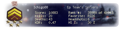 | Headshots | 6 | Suicides | 1 | Headshot / Kill | 30 % |