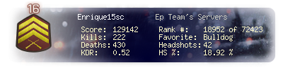 | Headshots | 13 | Suicides | 7 | Headshot / Kill | 15.48 % |