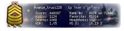 | Headshots | 185 | Suicides | 28 | Headshot / Kill | 17.27 % |